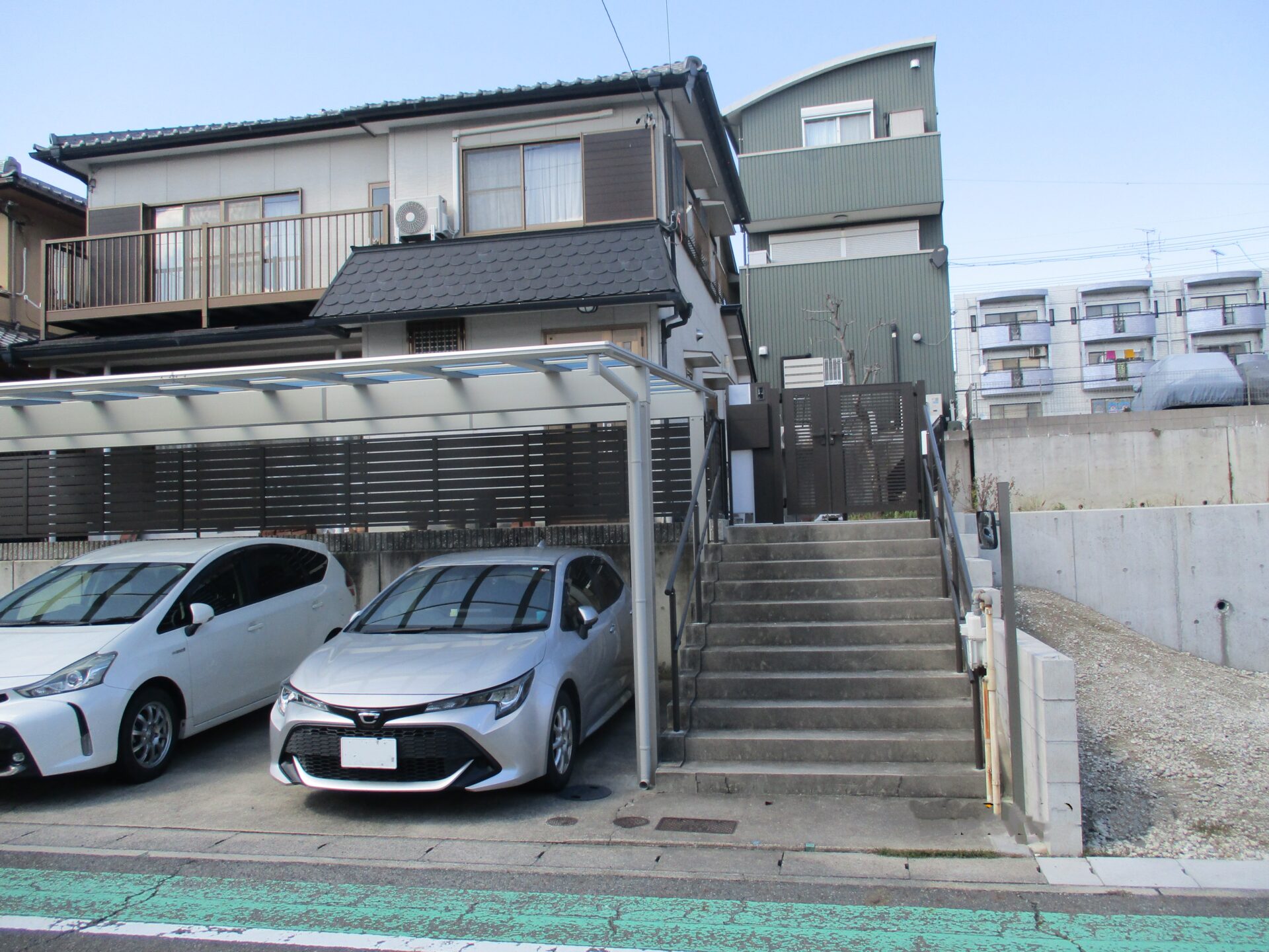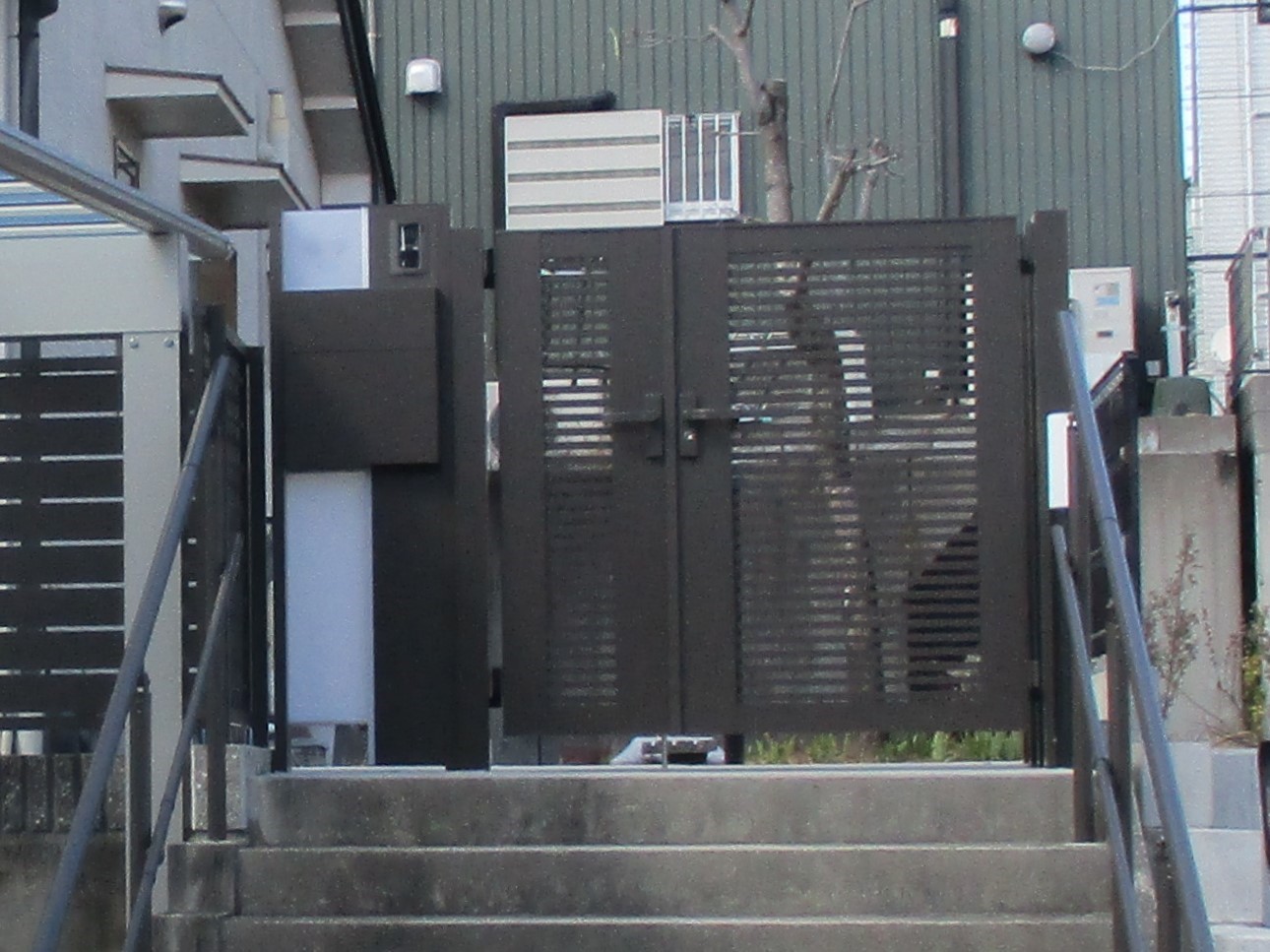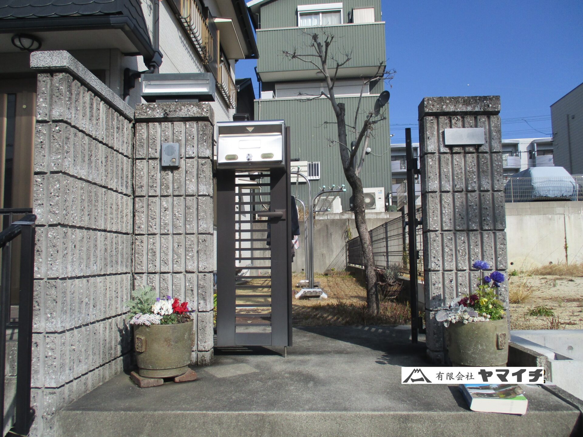 既設の化粧ブロックと門扉を撤去し、新たに機能門柱と門扉を設置しました。階段には両サイドに手すりを設置しました。