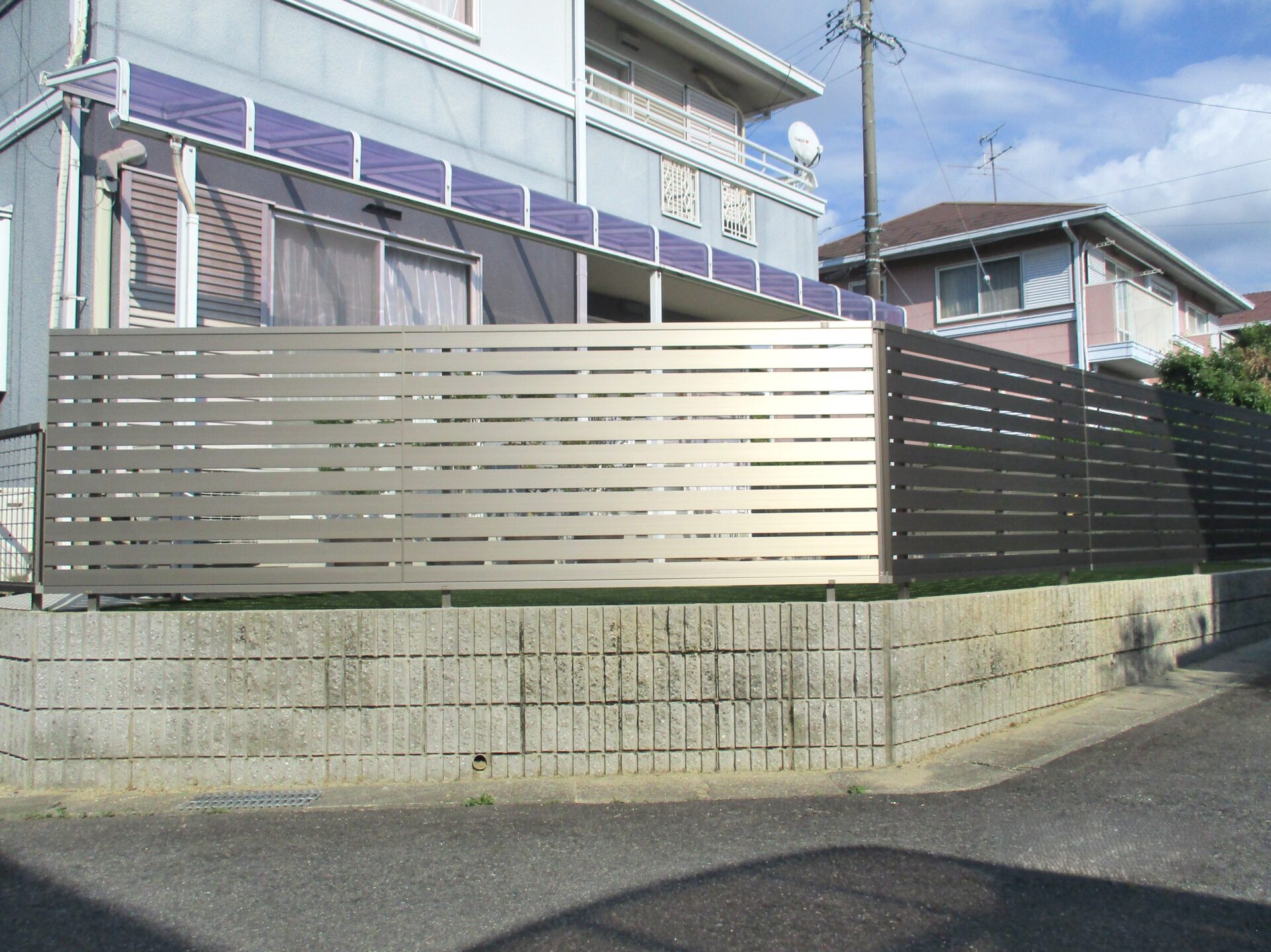 既存のブロックが沈下して水平ではない箇所も、フェンス下のクリアランスを細かく調整することで自然なラインに仕上げました。コーナー部分まで美しく納めることで、見た目にも違和感のない完成度に。フェンスには、スタイリッシュな三協アルミ レジリアYK3型/ニュータウンリード 2型、人工芝には、リアルな質感を追求したオビタス クロスターフW型を採用し、メンテナンス性とデザイン性を両立しました。