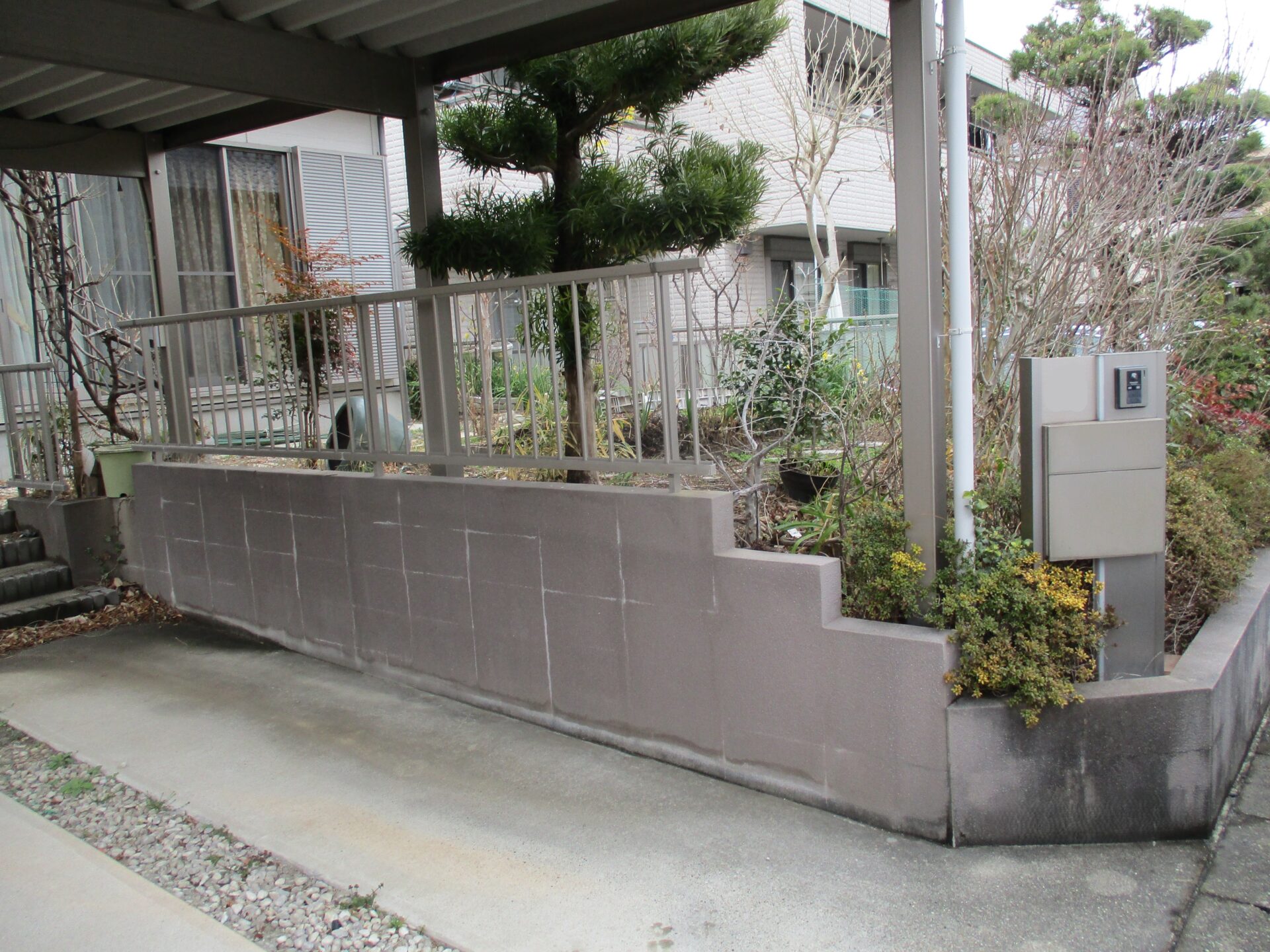 今回の工事では、既存の車庫との調和と、建物との距離感を保つ工夫がポイントでした。階段を増やすと敷地が狭く見えてしまうため、段差を車止め兼階段として対応し、圧迫感を抑えながら動線を確保しました。デザイン性と機能性を両立させ、無理のない自然な外構に仕上げました。